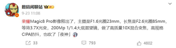搭载第五代骁龙8至尊版处理器,配备LPDDR5X+UFS4.1规格,采用magic OS 10操作系统,影像方面,会有2亿像素大底潜望式长焦摄像头,做了高质量10x混合变焦,拍远景和夜景很给力。
