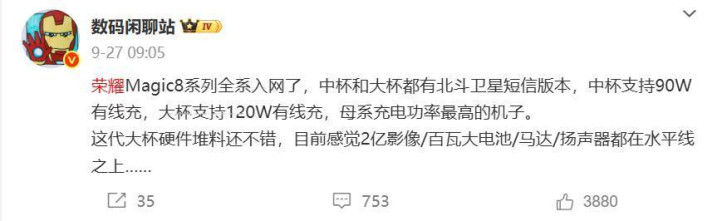 荣耀magic 8系列早已入网,而且官宣将在10月中旬发布,这大杯的荣耀magic 8 pro不仅有7200mAh大电池,还支持120w有线充电+无线充电,续航方面特别给力。
